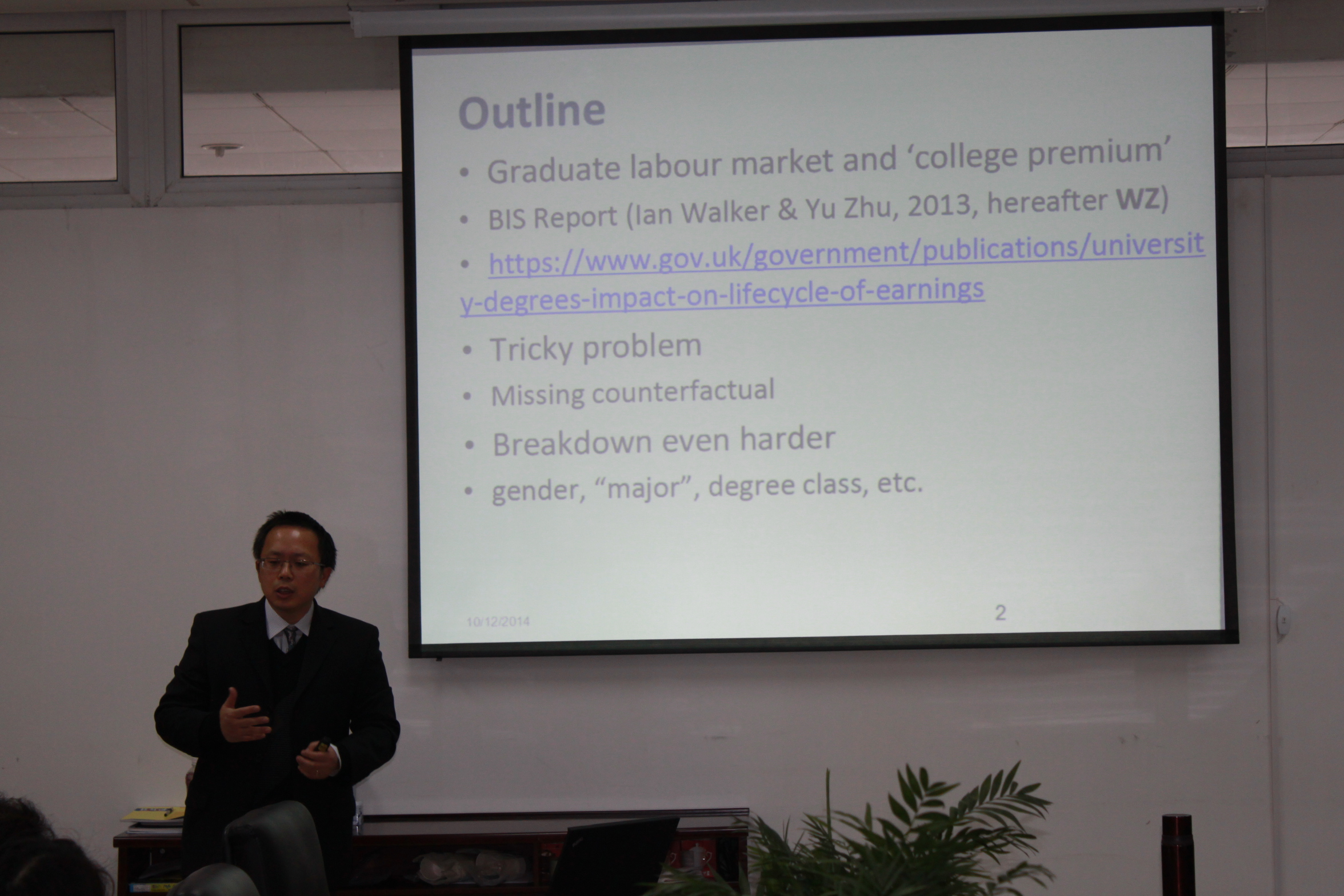 在报告伊始,朱宇博士首先对报告的前身进行了精彩的介绍。2012年英国中央政府出台决策——将大学生学费由3000英镑提升至9000英镑,并相应提高了对大学生的贷款额度和政府补贴力度。决策一经出台就引起巨大反响。正是在这样的背景下,英国政府决定设立研究项目,对新学费-资助-贷款体系下个人选择读大学“净收益”进行研究。朱宇博士和其合作伙伴的研究方案成功中标,其研究成果对英国政府的相关政策造成重要影响,成为了2013年英国政府决定新增25000个大学生名额的理论支撑。本次朱宇博士所作的报告正是对该研究成果的拓展和延伸。
