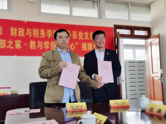 税务系党支部在德经楼408会议室举办支部共建签约仪式暨“支部之家·教与学指导中心”揭牌仪式。校党委常委、总会计师黄建元、校机关党委书记郝园园出席仪式,国有资产管理处处长丁书俊、副处长庄素娟、处长助理王建立,星空传媒