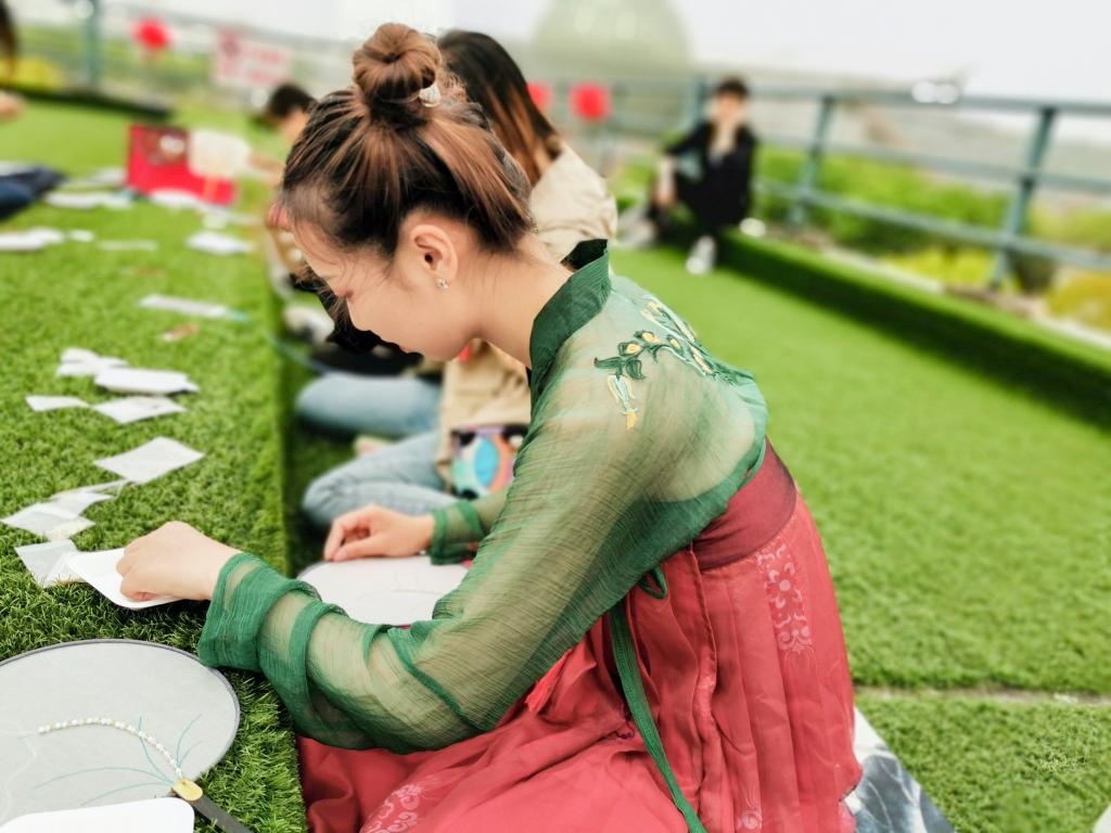 参加雅集的同学全部身着汉服,三五成群地参与到各类税收特色文化活动中,有的拿起针线仔细地在团扇上绣着象征农业的麦穗和“税”字,有的在宣纸上挥毫写下不同字体“税”,有的同学选择猜税法灯谜,还有人用红豆、绿豆、黄豆等粮食绘制谷物画。现场着实一派“文人墨客吟风颂月”的景象,而随处可见的“税”字也显现出同学们对专业的理解。活动负责人、星空传媒