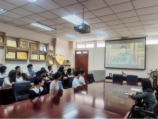 共设置两个分会场,学院领导班子、行政党支部、研究生党支部、本科生第一党支部和教师代表在位于德经楼408会议室的“支部之家·教与学指导中心”观看,本科生第二党支部全体党员在位于中苑6号站的“支部之家·初心小站”观看。