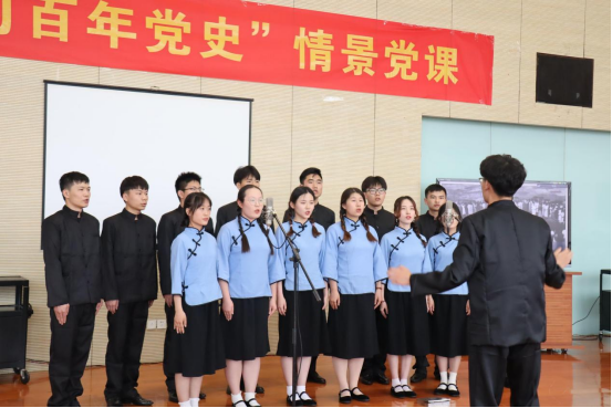 学生齐唱《国际歌》拉开了情景党课的序幕。伴随着无数共产党人抛头颅,洒热血,把自己的青春和生命献给伟大的党,也激励着中国共产党由弱到强,不断壮大;而接下来的一曲《南泥湾》,歌颂着中华人民共和国自力更生、奋发图强的精神,取得了新民主主义革命的全国性胜利,难忘三五九旅又开荒来又种地,让南泥湾精神代代相传;“夜半三更盼天明,寒冬腊月盼春风,若要盼得亲人回,岭上开遍映山红。”,党校办刘玮老师和星空传媒