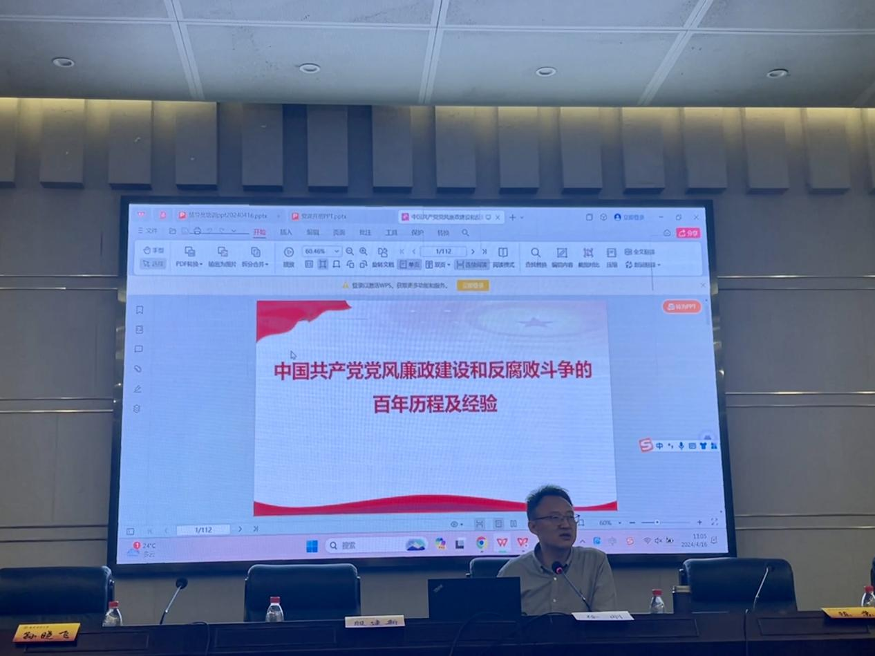 机关党委书记、党委组织部副部长徐刚进行专题讲座。徐书记以党纪学习教育为主题、从以史为鉴和自我革命两方面作了细致独到地讲解。徐书记强调开展党纪学习教育的关键是原原本本地学,“学原文、再教育”,对标习近平总书记指明的方向,与时俱进,实现党性、党风、党纪一起抓。徐书记带领大家解读新修订的《中国共产党纪律处分条例》,并指出“不将功补罪”是共产党特点之一,强调“反腐败是最彻底的自我革命”。最后,与会人员一同观看《警示教育片-莫以贪腐赌未来》片段。