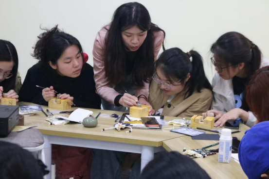 李老师拿出印石、印泥、刻刀等篆刻材料和工具,给同学们详细讲解如何分辨印石的大致品种以及如何正确使用刻刀等篆刻工具。李老师在讲解完篆刻的基本知识后,同学在指导下现场体验篆刻,从设计勾勒出印稿到持刻刀治印再到修饰调整印章最后进行钤印、刻边款及拓边款的详细过程。同学们依次进行篆刻的印稿设计、操刀治印等环节。