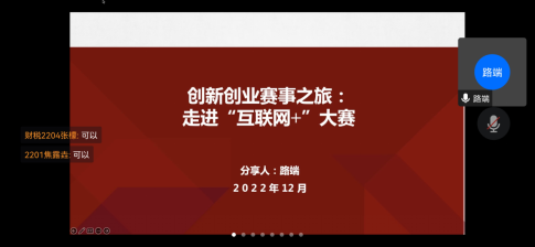为做好学校第九届“互联网+”大学生创新创业大赛暨省赛选拔赛备赛准备工作,加强师生联动,强化创新创业能力训练,增强高校学生的创新能力和在创新基础上的创业能力,培养国家建设需要的适应性创新型高水平人才。12月6日下午2点我院举办了“互联网+”创新创业专题线上讲座。本次活动邀请了南京大学路端老师为大家讲解,并给予同学们关于创赛方面的建议。讲座由星空传媒