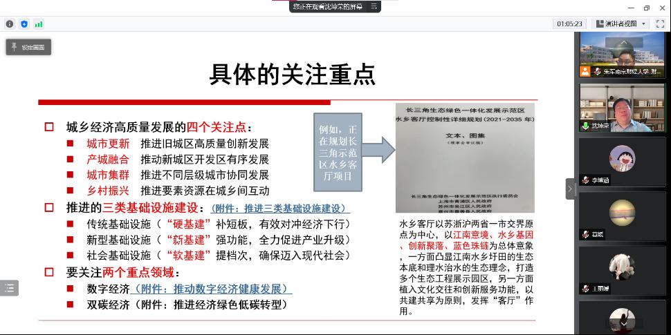 沈坤荣教授首先对中国当前经济运行现状进行分析,通过数据直观展现指出未来需要高度关注民营企业和基层政府行为的最新动态,强调以经济建设为中心推动经济质和量的合理增长。接下来,通过经济发展的阶段演变与深层原因表明未来的重中之重是要通过扩大中等收入群体的方式增加市场的消费需求,为区域经济持续增长注入新的功能。最后,沈坤荣教授提出通过推动城市更新、创新金融工具、行业数字化和绿色化转型等途径对中国经济的动态演进与区域发展这一议题做出总结。