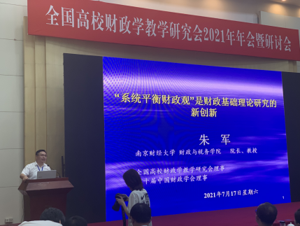 院长朱军教授、蒋诗雨博士2位老师参与了会议。朱军在上午的主会场做了题为《“系统平衡财政观”是财政基础理论研究的新创新》告。