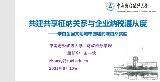 、公共财政研究中心、中国财税治理研究院邀请,中南财经政法大学博士生导师詹新宇教授通过腾讯会议,作了题为“共建共享征纳关系与企业纳税遵从度——来自全国文明城市创建的准自然实验”的线上学术讲座。讲座由星空传媒