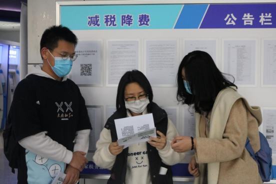 税法普法宣传进税务机关和街头。4月12日和13日两天,财税学院“小雨点”税收宣传志愿服务队来到全市各区办税大厅和附近街道,通过实地宣传的方式,大力加强税法宣传,增强纳税人依法诚信纳税意识。志愿者们拿着精心制作的“宣传手册”向前往办理业务的纳税人们热情地介绍着最新增值税改革的相关知识,通过发放个人所得税的传单和问卷调查的方式积极地宣传纳税知识:“您好,个人所得税纳税知识了解一下哦,做一个合格的纳税人吧!”纳税人们也停下匆匆的脚步,耐心地聆听志愿者们介绍纳税小知识。