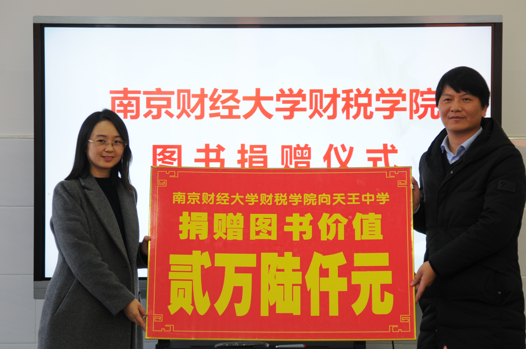 与句容市天王中学扶贫共建暨图书捐赠仪式在天王中学会议室举行。句容市副市长冯琳,天王镇镇长袁民,副镇长赵九红,句容教育局副局长徐燕,天王中学副校长陈远明,财税学院党委书记陈苏,副院长(主持工作)朱军,党委副书记李慕原,教工党员代表李婧等出席了该签约仪式。