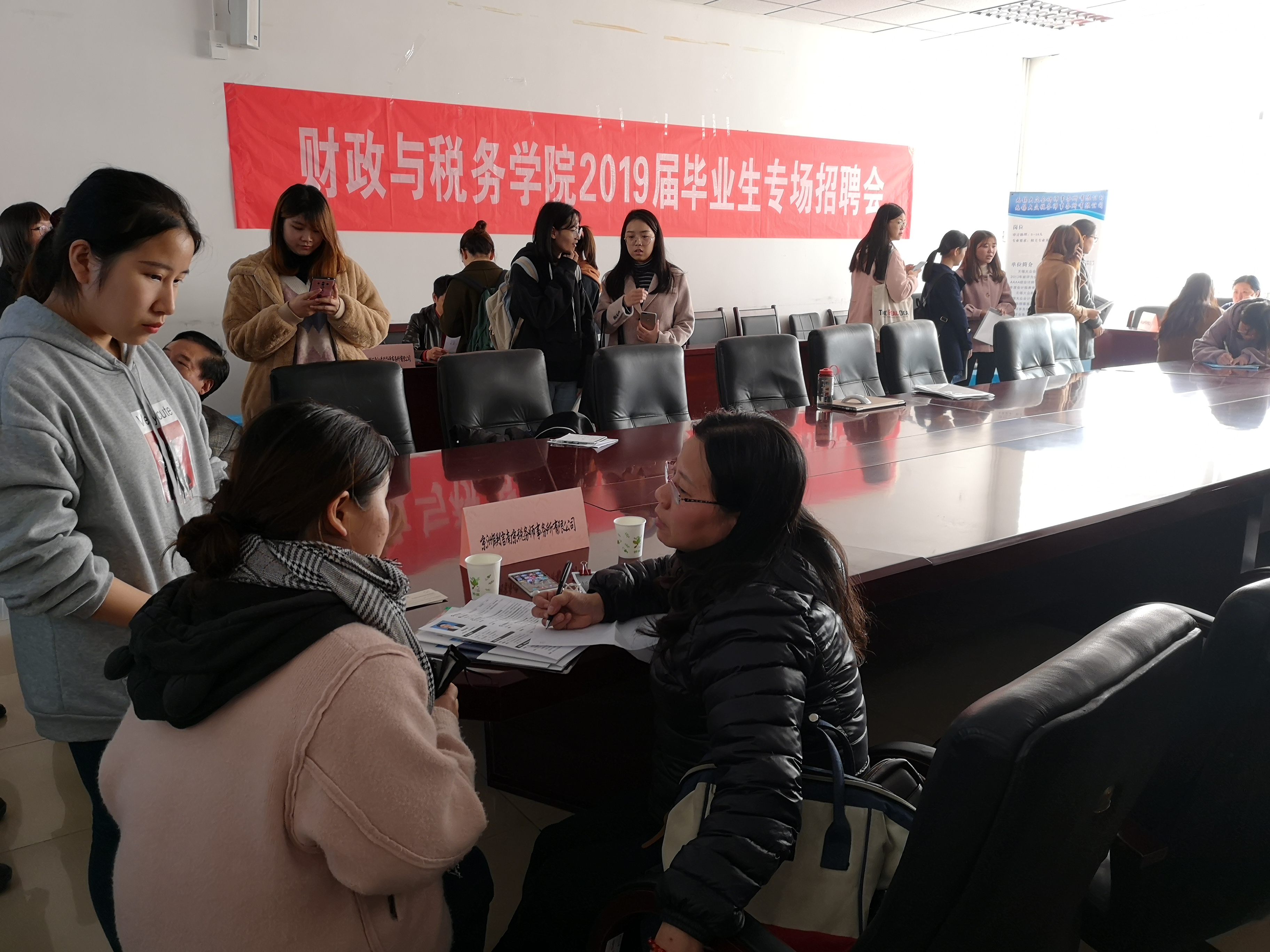 下午,学院在仙林校区德经楼408会议室举办秋季毕业生专场招聘活动,江苏峰上税务师事务所、京洲联信税务师事务所、宁波银行南京分行营业部等单位应邀参加招聘会,并提供了几十个个就业、实习岗位。江苏省注册税务师协会副会长于阜宁,办公室主任徐华敏出席招聘会,2019届毕业生参加了招聘活动。
