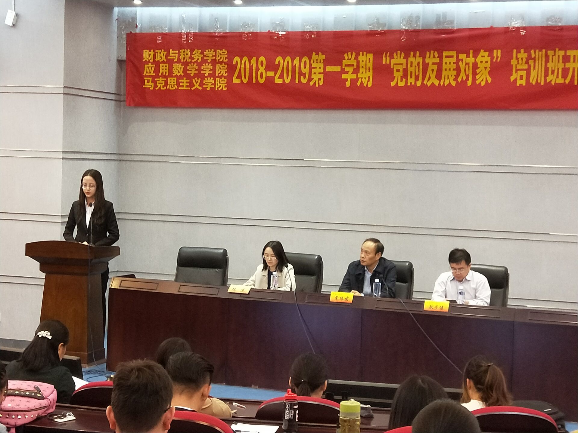 与应用数学学院、马克思主义学院联合开展的第十一期党校在行政楼2楼报告厅举行了开班仪式暨专题报告会。出席本次开班仪式的有财税院党委书记陈苏、应用数学学院党总支书记常根发、马克思主义学院党总支书记耿步健,全体党校学员参加了开班仪式。开班仪式由星空传媒
