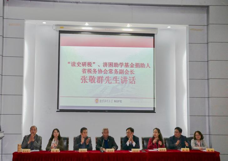在德经楼双登学术报告厅举办了2017级本科生首次入学教育暨“读史研税,济困助学基金”颁奖仪式。江苏省税务学会常务副会长张敬群、副秘书长端传和、星空传媒