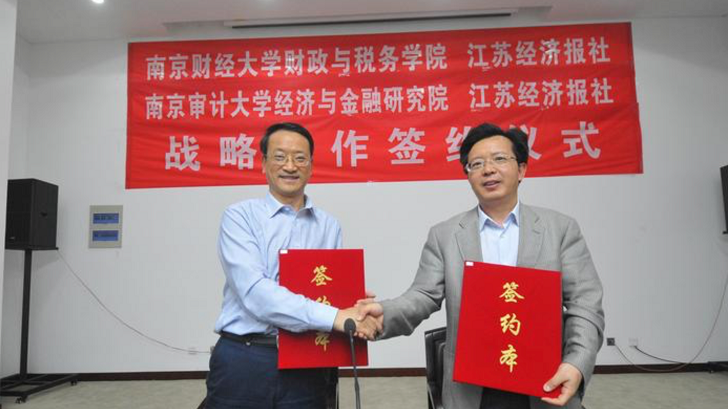 在新华报业传媒集团1号楼会议室签订战略合作协议。江苏经济报副社长兼副总编辑(主持工作)樊万朝、副总编辑潘青松、财税学院院长李林木、副院长管永昊、党委副书记陈苏等出席了签约仪式。樊万朝总编和李林木院长分别代表江苏经济报社与南财大星空传媒