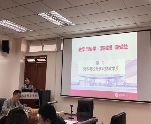 随后,蔡教授就财政学与税收学两个专业的关系展开自己的思考。蔡教授认为,财政学与税收学本身就是一个专业,两个专业本就不分彼此,相互促进。因此,蔡教授真切希望,两个系的教师在开展专业教学的过程中,要融合两个专业的特点,更好地从全局性和宏观性的角度为学生塑造财税思维,进一步弘扬学院的财税特色。同时,蔡教授也呼吁老师们要学会反思专业课的教学过程和教学结果,多从学生的角度理解教学的结果和评定方式,更好地在教学中实现师生互动,教学相长。比如,在教学过程中灵活使用课堂备忘录、灵活提问、鼓励主动发言、采用贴近热点和生活的作业等方式激发学生的兴趣。