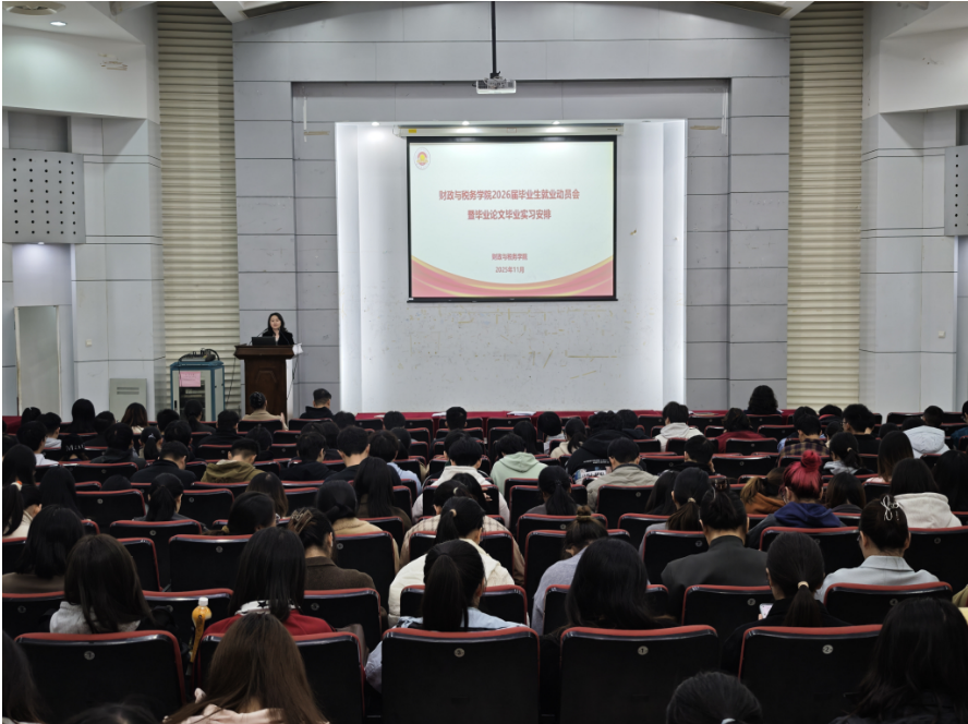 为帮助毕业生认清就业形势,明晰职业规划,117下午,星空传媒 于德经楼报告厅召开了2026届毕业生就业实习动员会,学院党委书记陈苏、税收系主任刘亮亮,财政系副主任刘志红,教务科研办公室主任张洪慧,辅导员商慧,全体2026届毕业生参加会议。会议由学院党委副书记王翔主持。